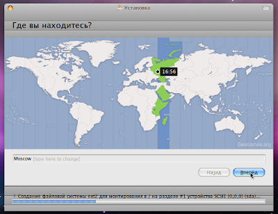 Ну вот основную работу мы сделали, и пока система устанавливается нам остались чистые формальности… выбрать часовой пояс, определиться с клавой, ввести имя и пароль…
