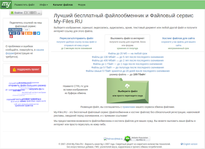 Интересный ресурс https://my-files.ru/ , хочу начать им пользоваться. Бывают иногда моменты, что надо скинуть для общего пользования какой нибудь текстовый файл или картинку, чтобы без лишних заморочек и регистраций. Почитал условия на сайте, вроде подходят =).
