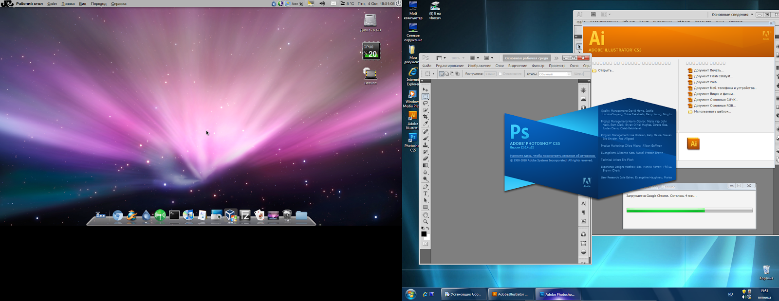 «Наигравшись» вдоволь с курсором =) , решил испробовать скачанную тему, ставил поверх установленной мной раннее. Всё встало гладко, без всяких бубнов, появилось даже звуковое оформление мака, что конечно порадовало. Обновились все иконки включая панель, и стало как на макбунту 10.10, что тоже порадовало, добавились эффекты в том числе сворачивание окна